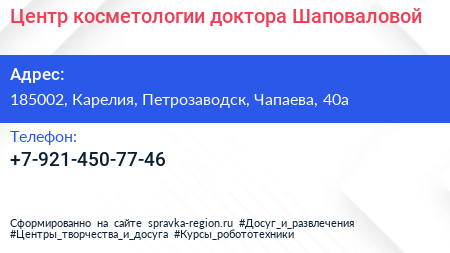 Центр косметологии доктора Шаповаловой по адресу 185002, Карелия, Петрозаводск, Чапаева, 40а в дальнейшем Организация, размещена в следующих категориях: