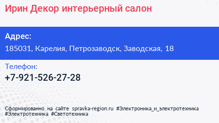 Ирин Декор, интерьерный салон по адресу 185031, Карелия, Петрозаводск, Заводская, 18 в дальнейшем Организация, размещена в следующих категориях: