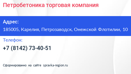 Петробетоника, торговая компания по адресу 185005, Карелия, Петрозаводск, Онежской Флотилии, 10 в дальнейшем Организация, размещена в следующих категориях: