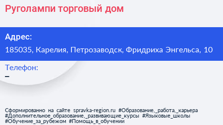 Руголампи, торговый дом по адресу 185035, Карелия, Петрозаводск, Фридриха Энгельса, 10 в дальнейшем Организация, размещена в следующих категориях: