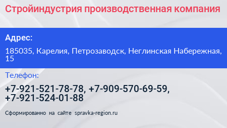 Стройиндустрия, производственная компания по адресу 185035, Карелия, Петрозаводск, Неглинская Набережная, 15 в дальнейшем Организация, размещена в следующих категориях: