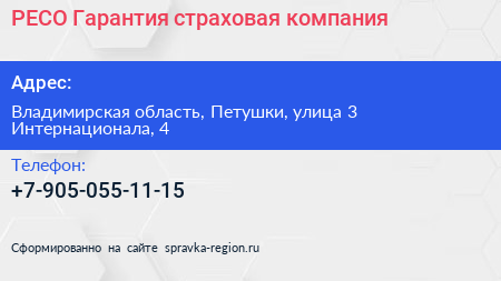 РЕСО-Гарантия, страховая компания по адресу Владимирская область, Петушки, улица 3 Интернационала, 4 в дальнейшем Организация, размещена в следующих категориях:
