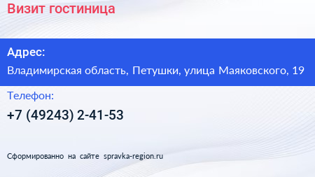 Визит, гостиница по адресу Владимирская область, Петушки, улица Маяковского, 19 в дальнейшем Организация, размещена в следующих категориях: