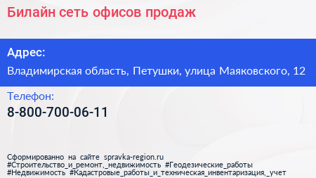 Билайн, сеть офисов продаж по адресу Владимирская область, Петушки, улица Маяковского, 12 в дальнейшем Организация, размещена в следующих категориях: