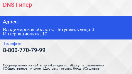 DNS Гипер по адресу Владимирская область, Петушки, улица 3 Интернационала, 10 в дальнейшем Организация, размещена в следующих категориях: