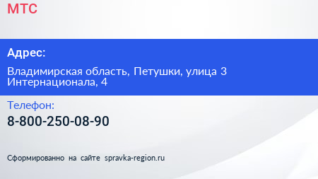 МТС по адресу Владимирская область, Петушки, улица 3 Интернационала, 4 в дальнейшем Организация, размещена в следующих категориях: