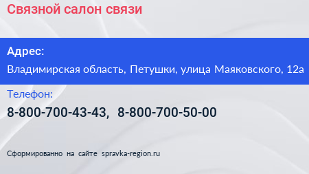 Связной, салон связи по адресу Владимирская область, Петушки, улица Маяковского, 12а в дальнейшем Организация, размещена в следующих категориях: