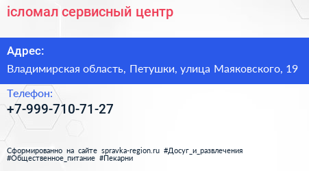 iсломал, сервисный центр по адресу Владимирская область, Петушки, улица Маяковского, 19 в дальнейшем Организация, размещена в следующих категориях:
