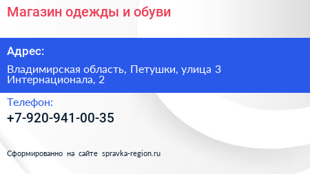 Магазин одежды и обуви по адресу Владимирская область, Петушки, улица 3 Интернационала, 2 в дальнейшем Организация, размещена в следующих категориях: