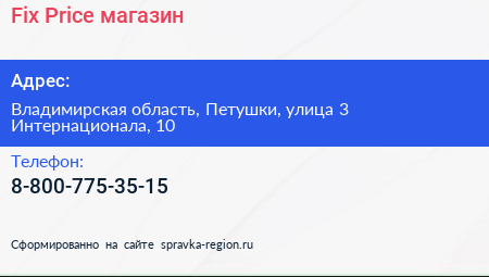 Fix Price, магазин по адресу Владимирская область, Петушки, улица 3 Интернационала, 10 в дальнейшем Организация, размещена в следующих категориях: