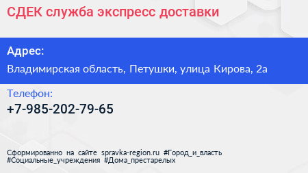 СДЕК, служба экспресс-доставки по адресу Владимирская область, Петушки, улица Кирова, 2а в дальнейшем Организация, размещена в следующих категориях: