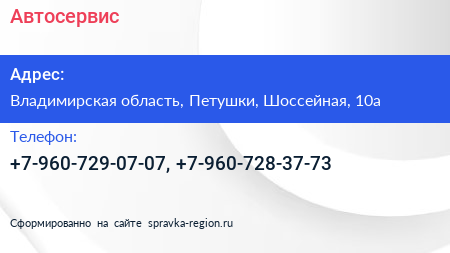 Автосервис по адресу Владимирская область, Петушки, Шоссейная, 10а в дальнейшем Организация, размещена в следующих категориях: