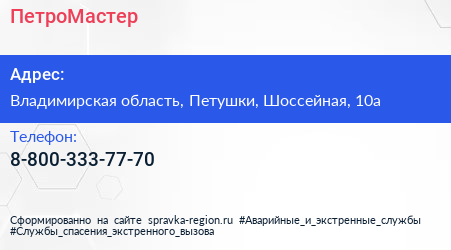 ПетроМастер по адресу Владимирская область, Петушки, Шоссейная, 10а в дальнейшем Организация, размещена в следующих категориях: