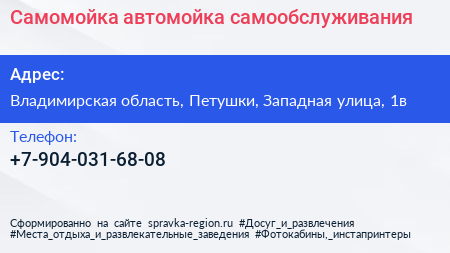 Самомойка, автомойка самообслуживания по адресу Владимирская область, Петушки, Западная улица, 1в в дальнейшем Организация, размещена в следующих категориях:
