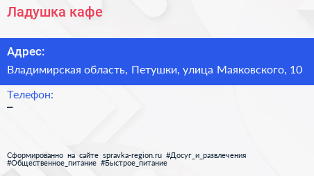 Ладушка, кафе по адресу Владимирская область, Петушки, улица Маяковского, 10 в дальнейшем Организация, размещена в следующих категориях: