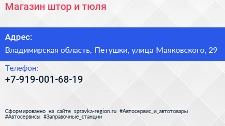 Магазин штор и тюля по адресу Владимирская область, Петушки, улица Маяковского, 29 в дальнейшем Организация, размещена в следующих категориях: