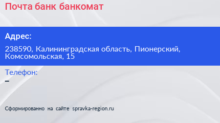 Почта банк, банкомат по адресу 238590, Калининградская область, Пионерский, Комсомольская, 15 в дальнейшем Организация, размещена в следующих категориях: