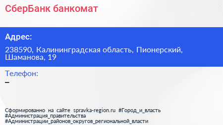 СберБанк, банкомат по адресу 238590, Калининградская область, Пионерский, Шаманова, 19 в дальнейшем Организация, размещена в следующих категориях: