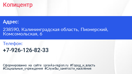 Копицентр по адресу 238590, Калининградская область, Пионерский, Комсомольская, 6 в дальнейшем Организация, размещена в следующих категориях: