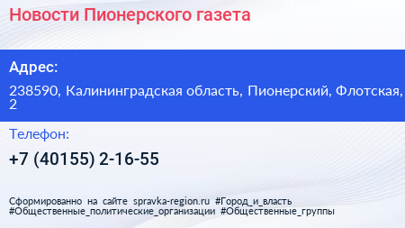 Новости Пионерского, газета по адресу 238590, Калининградская область, Пионерский, Флотская, 2 в дальнейшем Организация, размещена в следующих категориях: