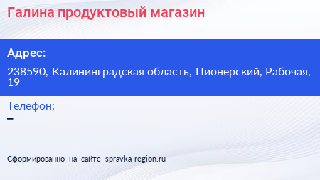 Галина, продуктовый магазин по адресу 238590, Калининградская область, Пионерский, Рабочая, 19 в дальнейшем Организация, размещена в следующих категориях: