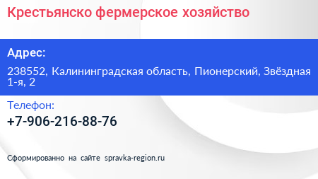 Крестьянско-фермерское хозяйство по адресу 238552, Калининградская область, Пионерский, Звёздная 1-я, 2 в дальнейшем Организация, размещена в следующих категориях: