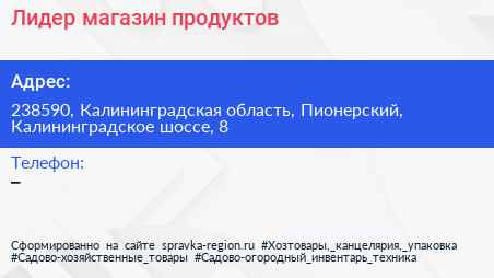 Лидер, магазин продуктов по адресу 238590, Калининградская область, Пионерский, Калининградское шоссе, 8 в дальнейшем Организация, размещена в следующих категориях: