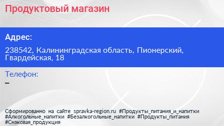 Продуктовый магазин по адресу 238542, Калининградская область, Пионерский, Гвардейская, 18 в дальнейшем Организация, размещена в следующих категориях: