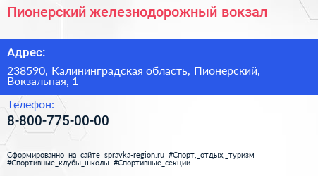 Пионерский железнодорожный вокзал по адресу 238590, Калининградская область, Пионерский, Вокзальная, 1 в дальнейшем Организация, размещена в следующих категориях: