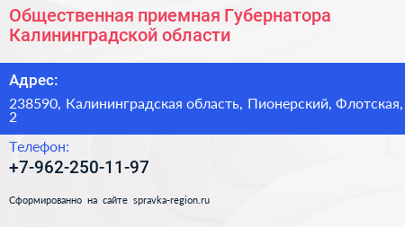 Общественная приемная Губернатора Калининградской области по адресу 238590, Калининградская область, Пионерский, Флотская, 2 в дальнейшем Организация, размещена в следующих категориях: