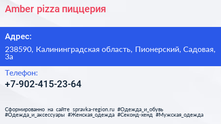 Amber pizza, пиццерия по адресу 238590, Калининградская область, Пионерский, Садовая, 3а в дальнейшем Организация, размещена в следующих категориях: