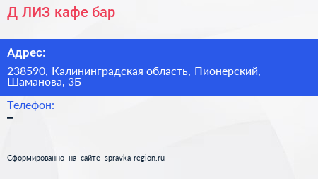 Д`ЛИЗ, кафе-бар по адресу 238590, Калининградская область, Пионерский, Шаманова, 3Б в дальнейшем Организация, размещена в следующих категориях: