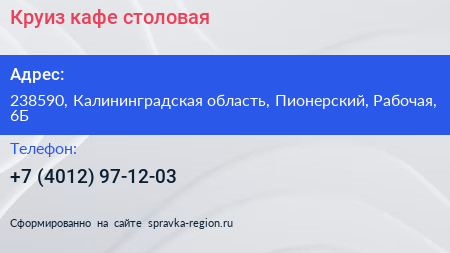 Круиз, кафе-столовая по адресу 238590, Калининградская область, Пионерский, Рабочая, 6Б в дальнейшем Организация, размещена в следующих категориях:
