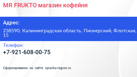 MR.FRUKTO, магазин-кофейня по адресу 238590, Калининградская область, Пионерский, Флотская, 15 в дальнейшем Организация, размещена в следующих категориях:
