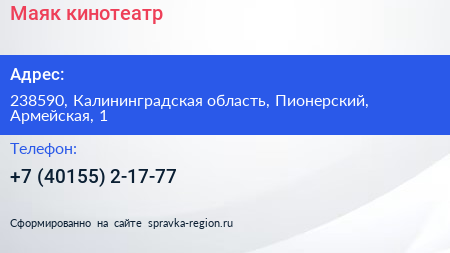 Маяк, кинотеатр по адресу 238590, Калининградская область, Пионерский, Армейская, 1 в дальнейшем Организация, размещена в следующих категориях: