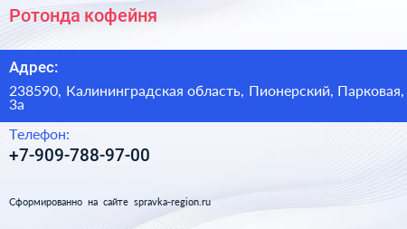 Ротонда, кофейня по адресу 238590, Калининградская область, Пионерский, Парковая, 3а в дальнейшем Организация, размещена в следующих категориях: