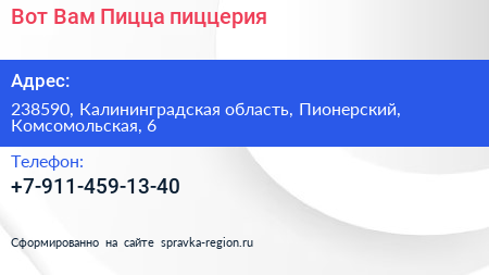Вот Вам Пицца, пиццерия по адресу 238590, Калининградская область, Пионерский, Комсомольская, 6 в дальнейшем Организация, размещена в следующих категориях: