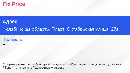 Fix Price по адресу Челябинская область, Пласт, Октябрьская улица, 27а в дальнейшем Организация, размещена в следующих категориях: