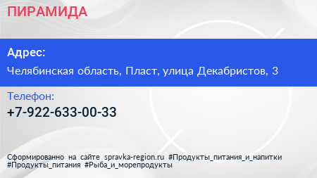 ПИРАМИДА по адресу Челябинская область, Пласт, улица Декабристов, 3 в дальнейшем Организация, размещена в следующих категориях: