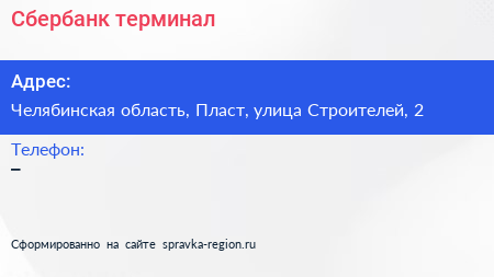 Сбербанк, терминал по адресу Челябинская область, Пласт, улица Строителей, 2 в дальнейшем Организация, размещена в следующих категориях:
