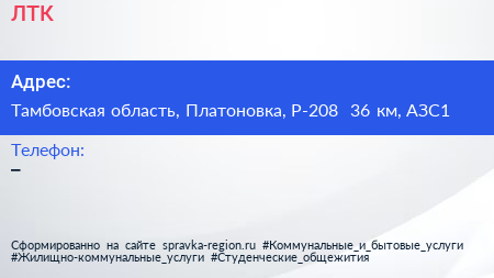 ЛТК по адресу Тамбовская область, Платоновка, Р-208 36 км, АЗС1 в дальнейшем Организация, размещена в следующих категориях: