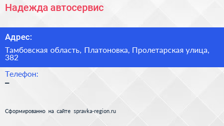 Надежда, автосервис по адресу Тамбовская область, Платоновка, Пролетарская улица, 382 в дальнейшем Организация, размещена в следующих категориях: