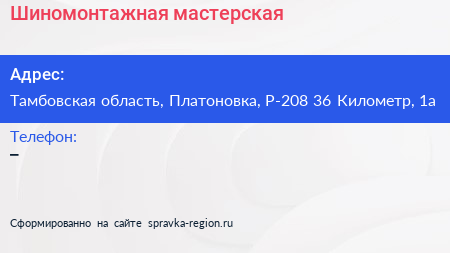 Шиномонтажная мастерская по адресу Тамбовская область, Платоновка, Р-208 36 Километр, 1а в дальнейшем Организация, размещена в следующих категориях: