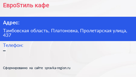 ЕвроSтиль, кафе по адресу Тамбовская область, Платоновка, Пролетарская улица, 437 в дальнейшем Организация, размещена в следующих категориях: