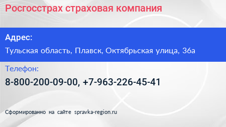 Росгосстрах, страховая компания по адресу Тульская область, Плавск, Октябрьская улица, 36а в дальнейшем Организация, размещена в следующих категориях: