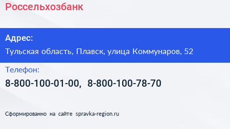 Россельхозбанк по адресу Тульская область, Плавск, улица Коммунаров, 52 в дальнейшем Организация, размещена в следующих категориях:
