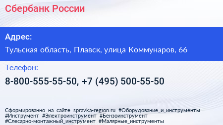 Сбербанк России по адресу Тульская область, Плавск, улица Коммунаров, 66 в дальнейшем Организация, размещена в следующих категориях: