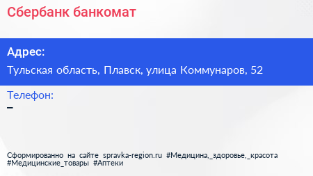 Сбербанк, банкомат по адресу Тульская область, Плавск, улица Коммунаров, 52 в дальнейшем Организация, размещена в следующих категориях: