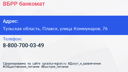 ВБРР, банкомат по адресу Тульская область, Плавск, улица Коммунаров, 76 в дальнейшем Организация, размещена в следующих категориях: