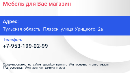 Мебель для Вас, магазин по адресу Тульская область, Плавск, улица Урицкого, 2а в дальнейшем Организация, размещена в следующих категориях: